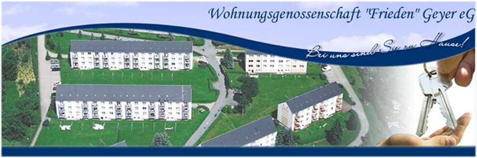 Herzlich willkommen bei der Wohnungsgenossenschaft "Frieden" Geyer eG! Gegründet wurde unsere Wohnungsgenossenschaft bereits 1959. Wir vermieten bzw. verwalten einen Wohnungsbestand von 270 Wohnungen. Alle Grund- und Bodenflächen befinden sich in unserem Besitz und werden durch uns bewirtschaftet. Die Außensanierung der Häuser wurde im Jahre 2003 komplett abgeschlossen. In den vergangenen Jahren war die Auslastung sowie die Nachfrage, nach unseren modernisierten Wohnungen in Geyer, sehr hoch, sodass wir glücklicherweise nur geringe Leerstände zu verzeichnen hatten. Wir freuen uns über Ihr Interesse an unseren Wohnungen und bedanken uns recht herzlich für Ihr "Vorbeischauen". Ihre Katrin Landmann, geschäftsführender Vorstand